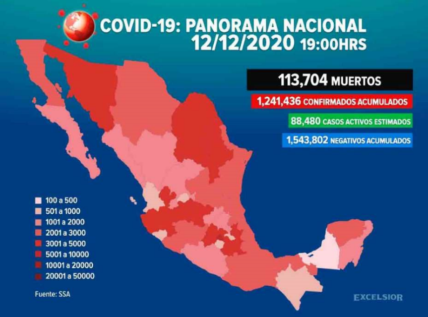Este sábado 12 de diciembre en el que se festeja a la virgen de Guadalupe, México registró 113 mil 704 fallecidos por la pandemia de Covid-19 hasta de acuerdo con cifras oficiales, mientras que el número de contagios por este patógeno suma ya un millón 241 mil 436 casos.