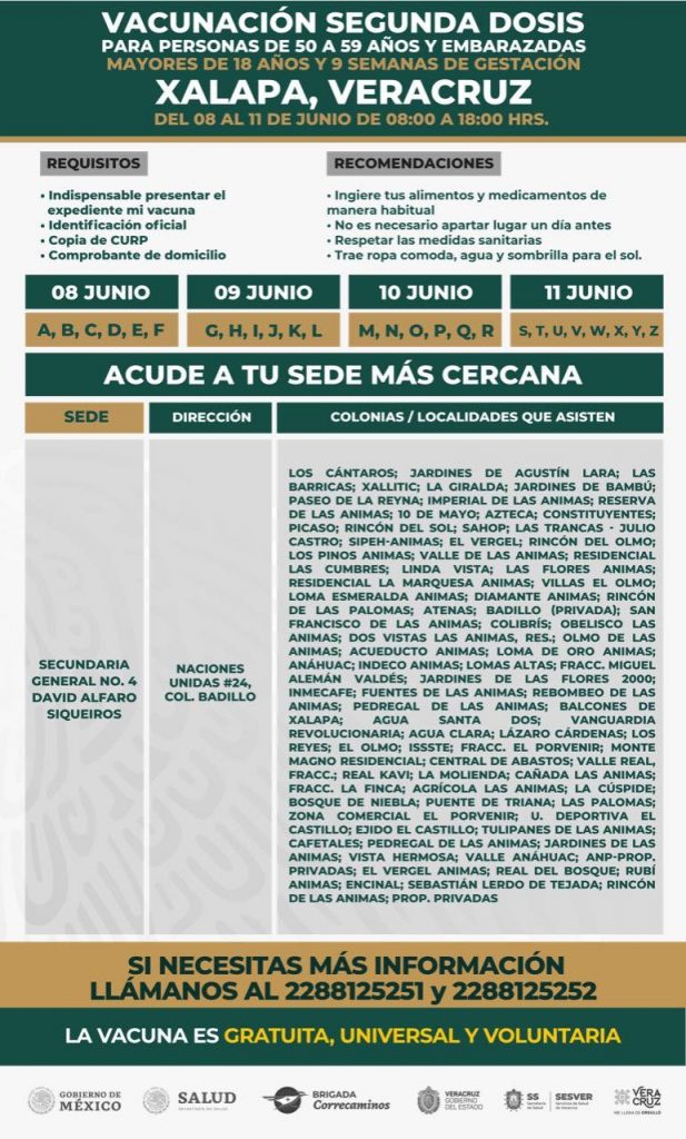 En gira de trabajo por los municipios en la supervisión de los centros de vacunación de Veracruz-Boca del Río, región centro Atzacan y Orizaba, señaló, las sedes de vacunación para la segunda dosis para Xalapa, adultos de 50 a 59 años.