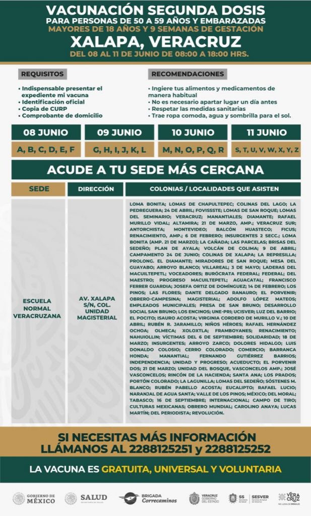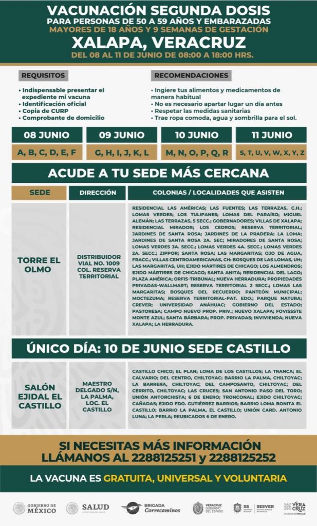 El 9 y 10 de junio corresponde las primeras dosis en generación 40-49 en Misantla, los días 9, 10 y 11 de junio, el municipio de San Andrés Tuxtla.