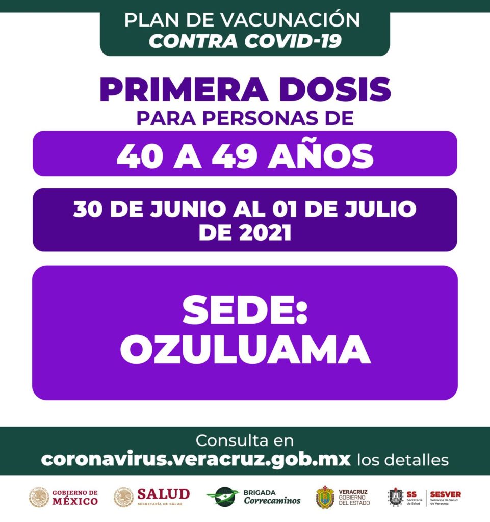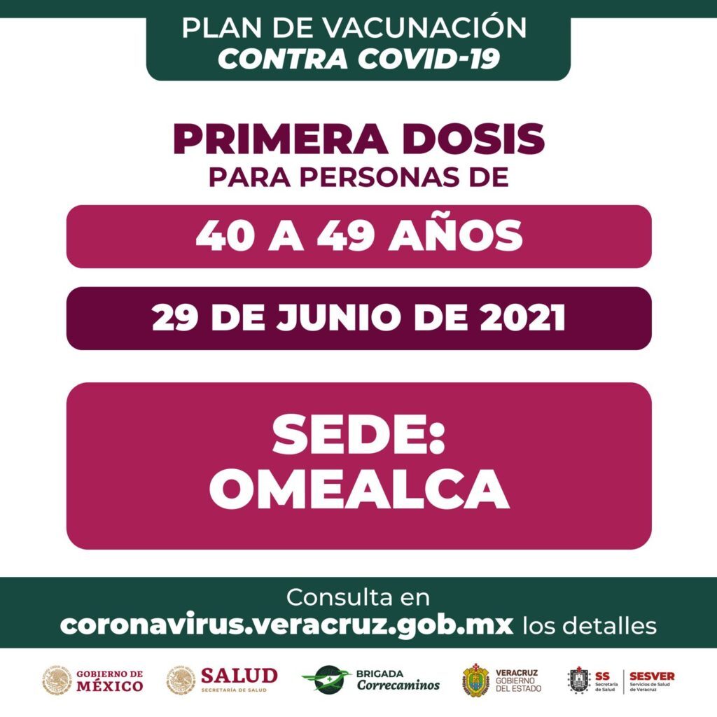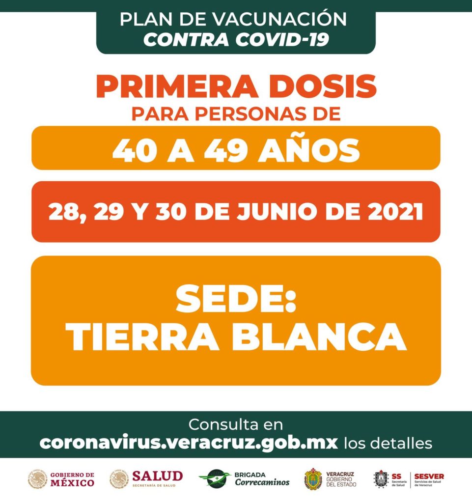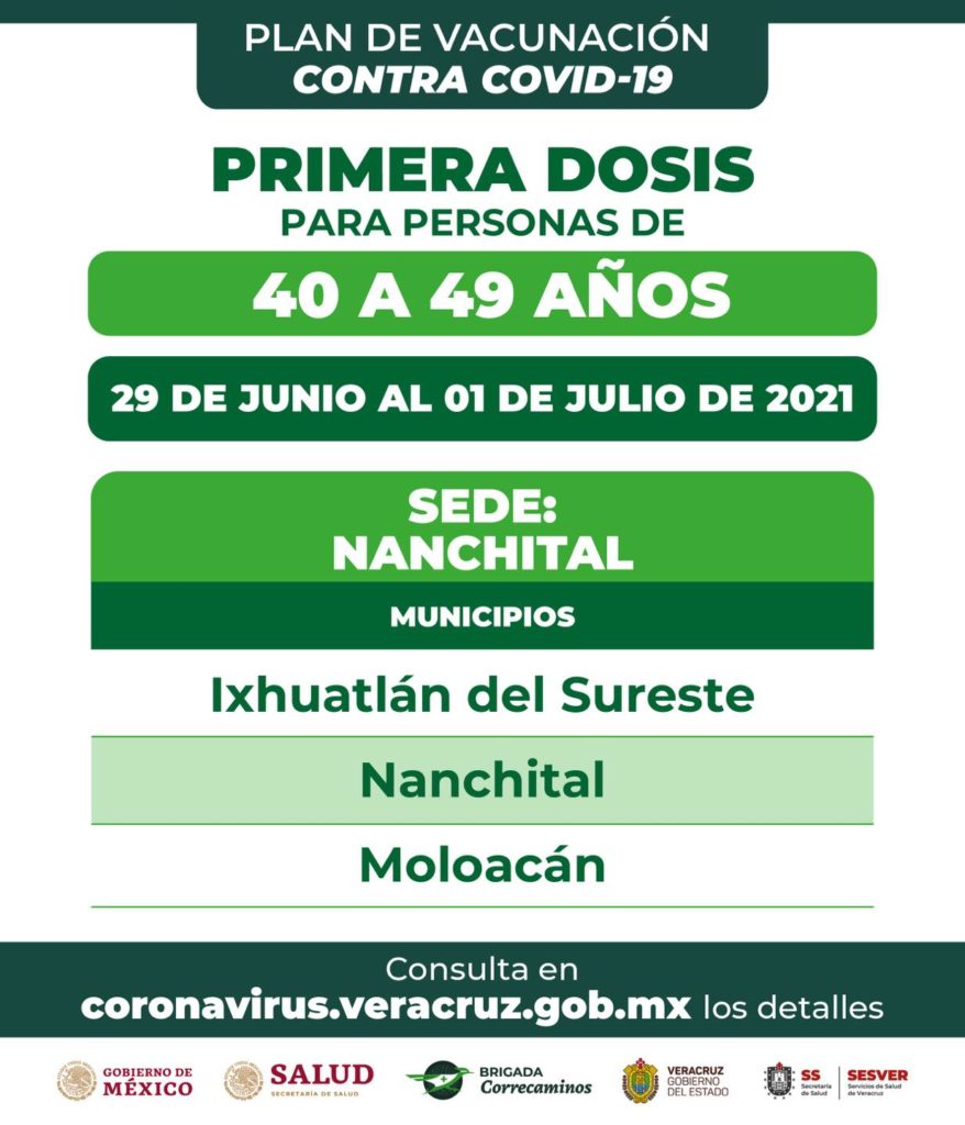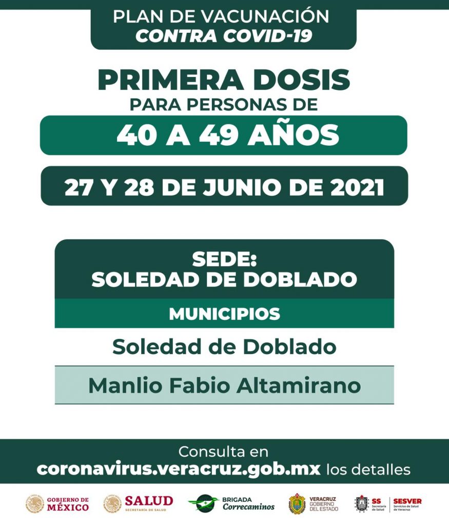 Estos serán los municipios donde se estará aplicando la vacunación a la población de 40 a 49 años del 27 al 1 de julio. Soledad de Doblado, Manlio Fabio Altamirano, Nanchital, Ixhuatlán del Sureste, Moloacán, Agua Dulce, Ozuluama, Tierra Blanca, Gutiérrez Zamora, Ixhuatlán de Madero, Tlachichilco, Omealca, Omealca, Cerro Azul, Tepetzintla: Gobernador Cuitláhuac García Jiménez.