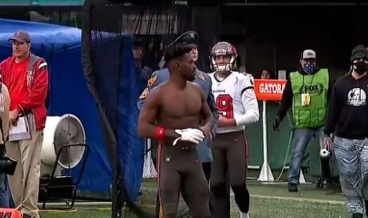 Durante el tercer cuarto, se pudieron ver algunos movimientos en el banquillo del equipo visitante. Las cámaras de la transmisión captaron el momento en el que Antonio Brown se quitaba la remera y los guantes para lanzárselos a la afición. Posteriormente, el jugador salió corriendo del campo de juego hacia los vestuarios. Nunca más regresó.