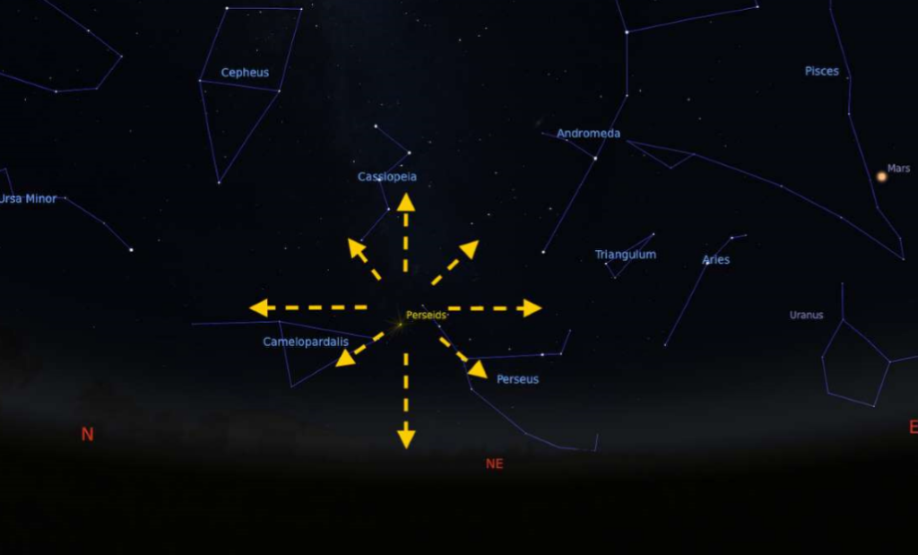 Recuerda que para observar una lluvias de estrellas no es necesario ningún instrumento óptico como un telescopio o binoculares: los meteoros aparecen cerca del radiante (en este caso, la constelación de Perseo) y recorren fugazmente el cielo en cualquier dirección.