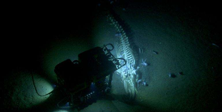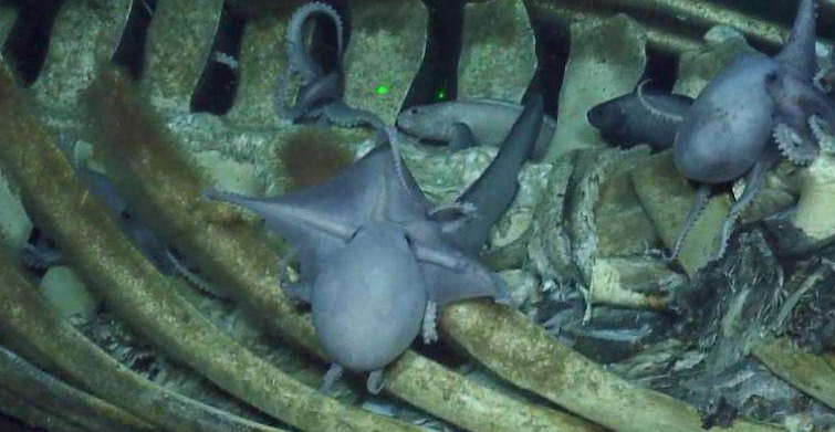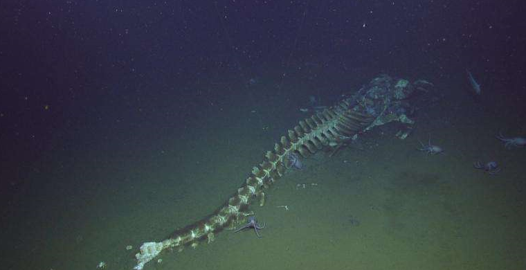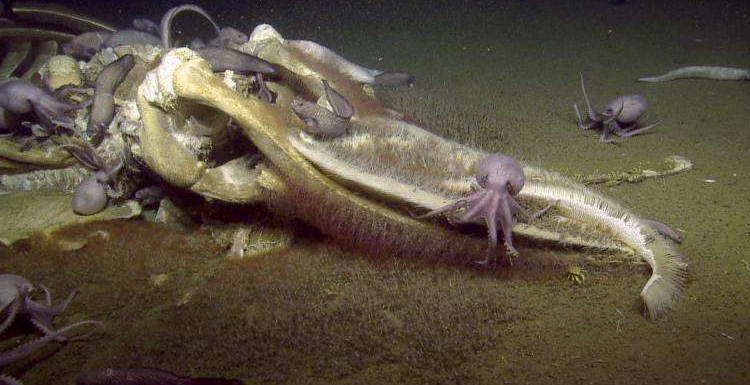 El cadáver estaba rodeado de pulpos del género Muusoctopus, gusanos devoradores de huesos que disuelven el esqueleto con ácido, crustáceos, caracoles, langostas y una especie de pez alargado con aspecto de anguila.