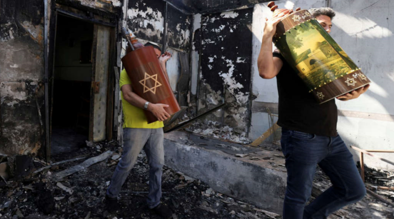 En Lod, hombres llevaban rollos de la Torá por el patio ennegrecido y lleno de escombros de una sinagoga incendiada.