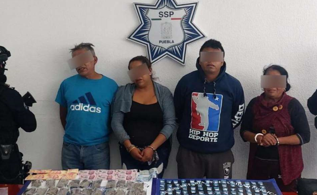 PUEBLA.- Karina H., Alfredo H., María C., y José Alfredo H., hermana, hermano, madre y padre respectivamente de Liliana H., quien se autodenomina como “La Reina del Sur”, fueron detenidos por agentes de la Policía Estatal en la junta auxiliar de San Francisco Totimehuacan en posesión de aparentes drogas. Los cuatro serían los principales distribuidores de estupefacientes en el sur de la capital.
