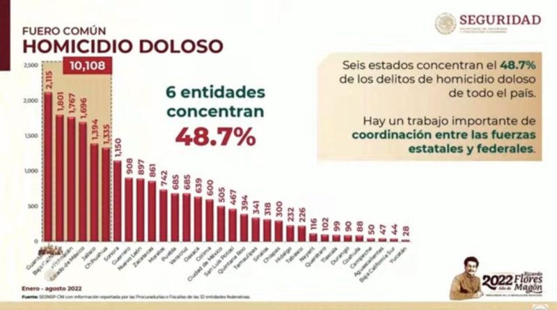 Xalapa, Ver., 03/10/22.- Donde hay buenos secretarios de Seguridad Pública y fiscales se ayuda mucho a combatir la delincuencia, afirmó el presidente Andrés Manuel López Obrador al presentar las cifras de homicidio doloso en las entidades federativas entre enero y agosto de 2022 por cada 100 mil habitantes.