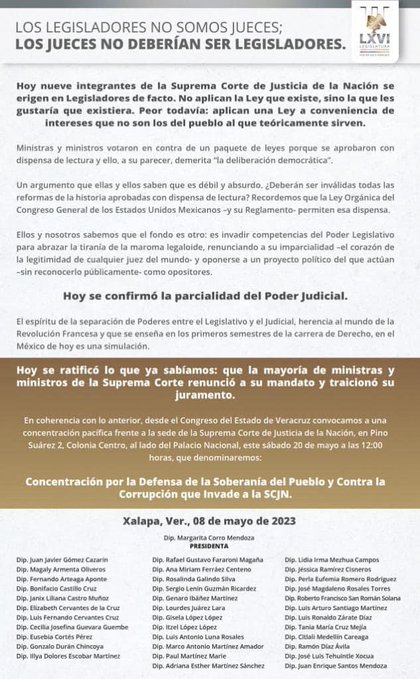 Ante esto, el Congreso de Veracruz informó que convoca a una concentración de manera pacífica el próximo sábado 20 de mayo a las 12 del día frente a la sede de la Suprema Corte de Justicia de la Nación.