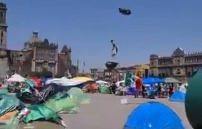 En el video se ve como las casas de campaña vuelan sobre la plancha del Zócalo, mientras algunos de los presentes intentan agarrarlas y volverlas a poner en el piso.