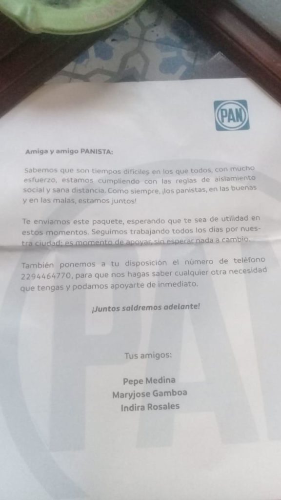 Circulan imágenes de una carta presuntamente firmada por la diputada local María Josefina Gamboa Torales, el exregidor de Veracruz y diputado federal suplente José Ricardo Medina Hernández y la senadora Indira de Jesús Rosales San Román, panistas los tres, que acompaña una despensa.