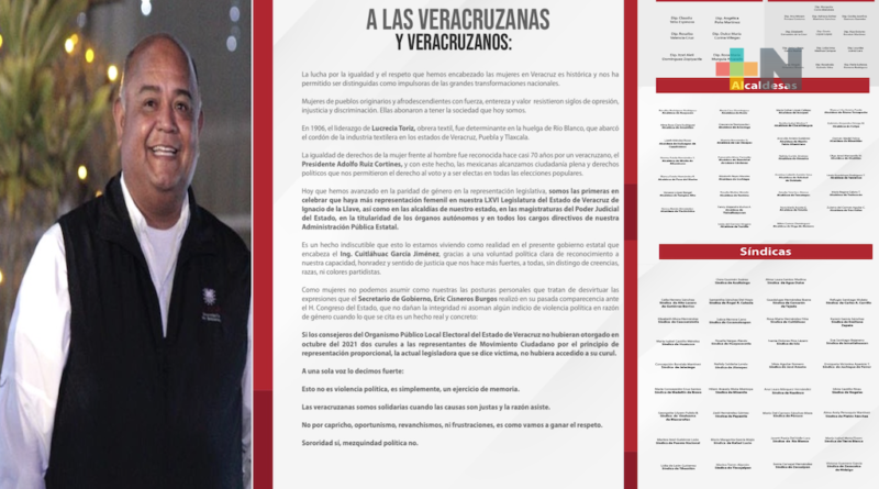 Xalapa, Ver.-  A través de un desplegado difundido en redes sociales, diputadas federales, locales, alcaldesas y síndicas manifestaron su respaldo al secretario de Gobierno, Eric Cisneros Burgos; descartando que en su comparecencia efectuada en días pasados ante la Legislatura local haya incurrido en violencia política en razón de género en agravio de una legisladora de Movimiento Ciudadano.