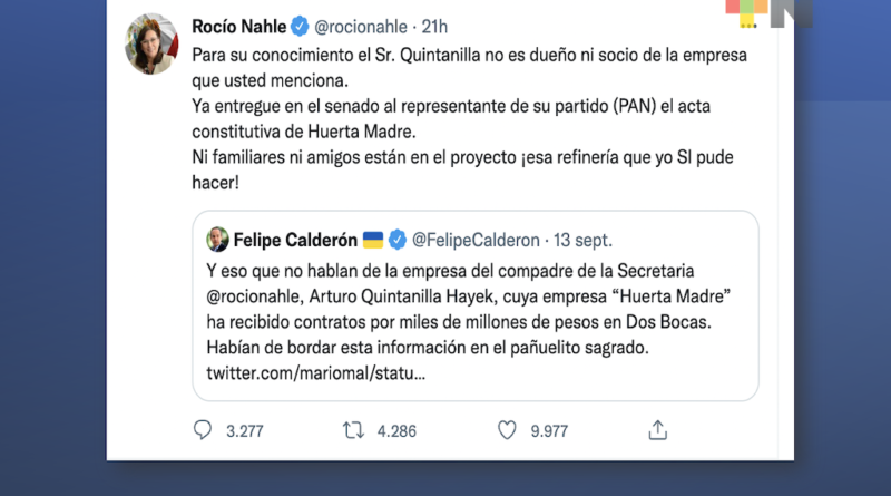 Tras un mensaje emitido en la red social Twitter por parte del expresidente Felipe Calderón, donde acusa a la secretaria de Energía, Rocío Nahle de supuestamente beneficiar con contratos preferenciales a la compañía de su compadre Arturo Quintanilla Hayek, la propia titular de la SENER le reviró su calumnia por la misma vía de comunicación.