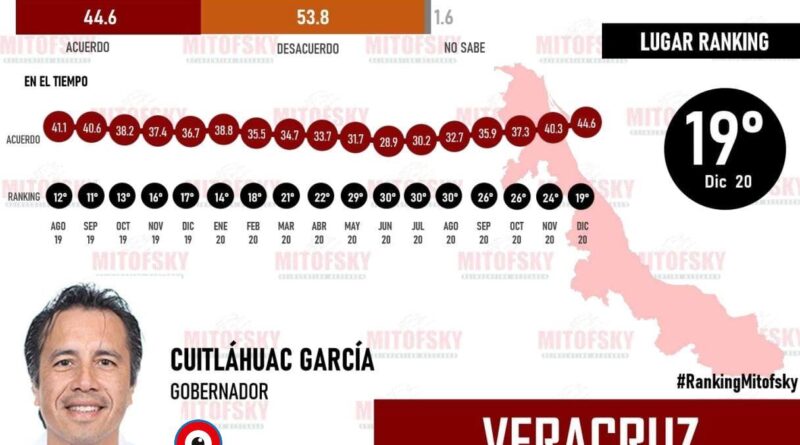 Xalapa, Ver., 11/01/21.- El gobernador Cuitláhuac García Jiménez continúa avanzando en la posición de mandatarios con mejor aprobación a nivel nacional; en diciembre de 2020 ocupó el lugar número uno entre “Los Gobernadores con mayor incremento en su aprobación”.