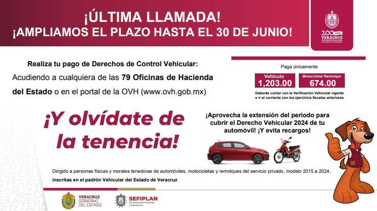 También, se invita a propietarios de motocicletas y remolques nunca emplacados en el estado de Veracruz a aprovechar esta prórroga de dos meses para inscribirse en el padrón vehicular mediante el pago único de mil 324 pesos, en cualquiera de las Oficinas de Hacienda del Estado.