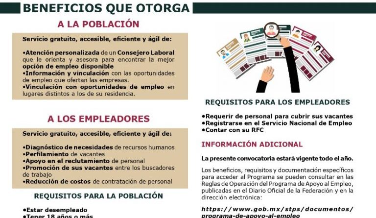 Los requisitos son no tener trabajo, tener 18 años o más, CURP y darse de alta ante el Servicio Nacional de Empleo (SNE). Toda la información relacionada estará vigente durante el 2021 y puede consultarse en www.gob.mx/stps/es/documentos/programa-de-apoyo-al-empleo.