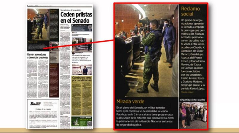 El pasado 22 de septiembre, Reforma publicó una imagen en la que se ve a un militar tomando fotografías en la Cámara de Senadores. La tituló con la frase ‘Mirada verde’ y escribió el siguiente pie de foto: «en el Pleno del Senado un militar tomaba fotos ayer mientras se desarrollaba la sesión. Para hoy en la Cámara Alta se tiene programada la discusión de la reforma que amplía hasta 2028 la permanencia de la Guardia Nacional en tareas de seguridad pública».