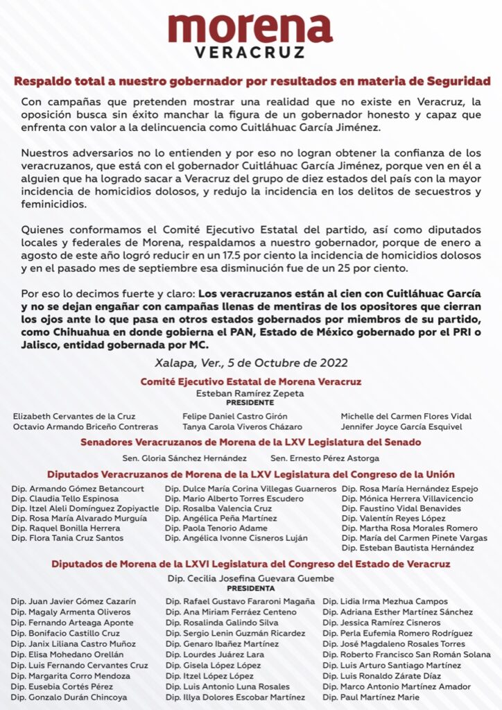 A través de dicho comunicado, que fue firmado por integrantes del Comité Ejecutivo Estatal de Morena, así como por Senadores de la República, Diputados y Diputadas Federales y Locales, señalan que con campañas la oposición busca sin éxito manchar la figura de un gobernador honesto y capaz que enfrenta con valor a la delincuencia, como Cuitláhuac García Jiménez