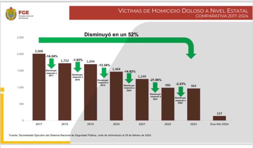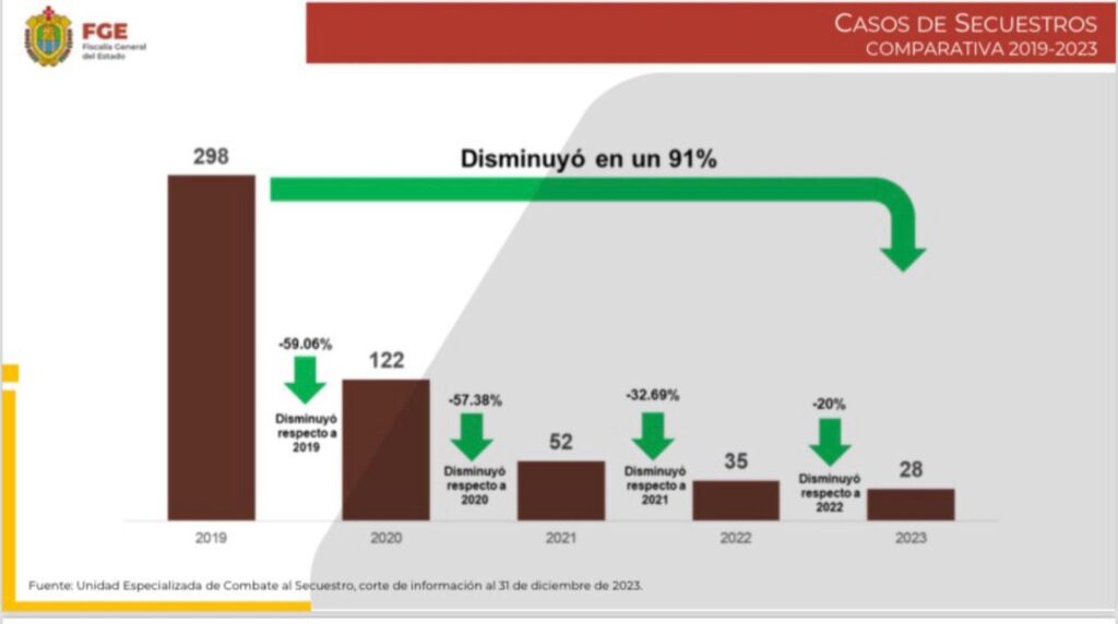 Redacción.- En Veracruz existe un descenso contundente respecto a los casos de secuestros con una disminución del 91 por ciento del 2019 al 2023, mientras que las víctimas de homicidio doloso continúan con una tendencia descendente.