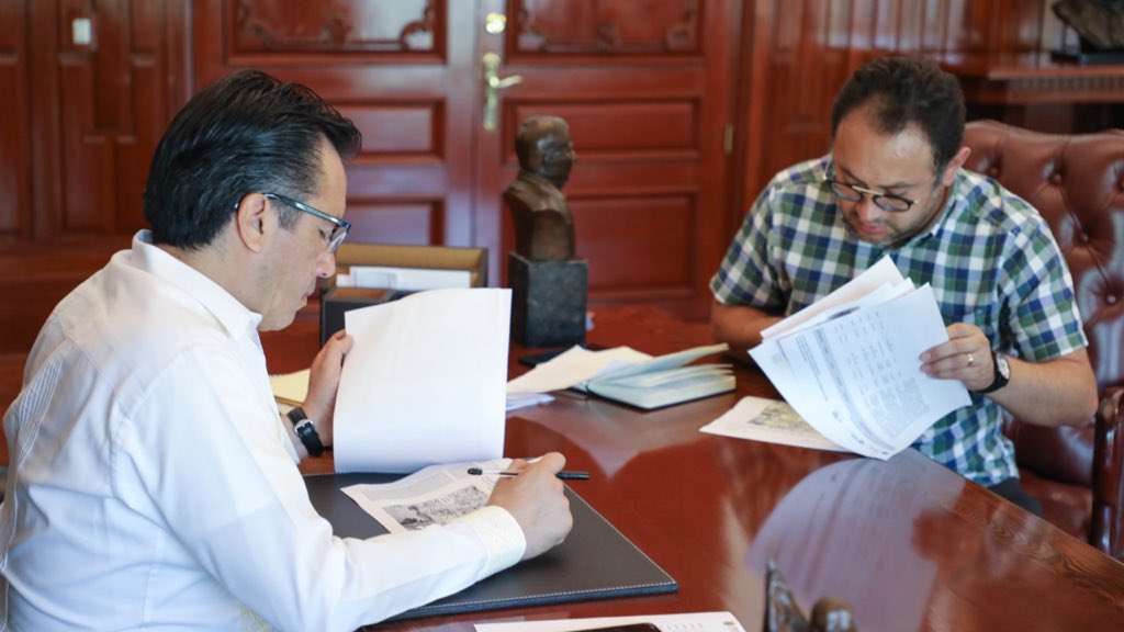 En su red social de Twitter el mandatario escribió que había reunidos con los titulares de la Secretaría de Finanzas y Planeación Jose Luis Lima Franco y de la Secretaría de Infraestructura y Obras Públicas Elio Hernández Gutiérrez.