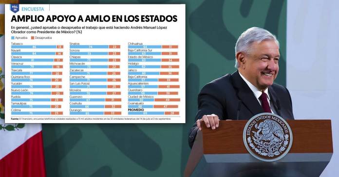 Los estados donde AMLO tiene su mayor respaldo son Tabasco, Nayarit y Oaxaca, con 86, 84 y 81 por ciento, respectivamente.