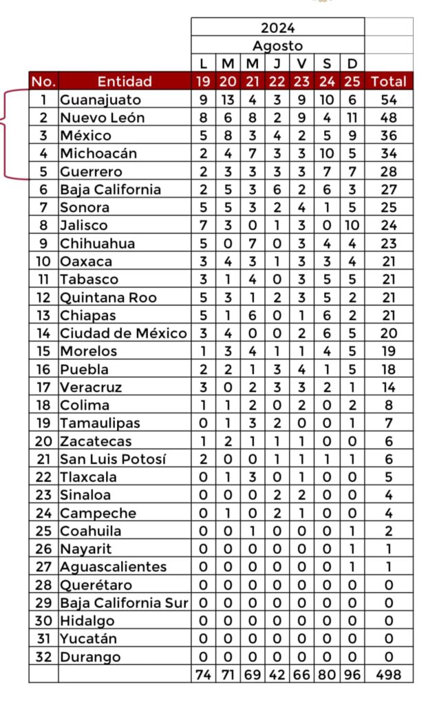 Publiqué parte de la lista el martes, pero esta es la lista completa de los 32 estados sobre homicidios dolosos en la última semana. Así vamos en Veracruz”.