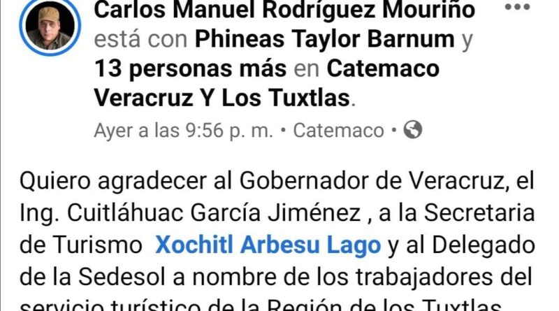 “Quiero agradecer al Gobernador de Veracruz, el Ing. Cuitláhuac García Jiménez , a la Secretaria de Turismo Xochitl Arbesu Lago y al Delegado de la Sedesol a nombre de los trabajadores del servicio turístico de la Región de los Tuxtlas por los apoyos alimentarios que ya se les está brindando. A este sector productivo que tanto representa para los Tuxtlas”.