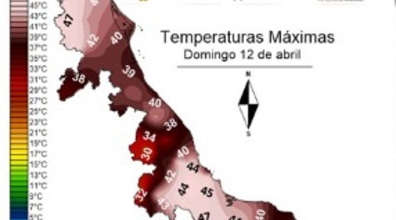 Emite un mapa en el cual destaca posibles temperaturas de hasta 44 grados Celsius en la entidad. Señala que para este domingo, se espera una temperatura máxima en zona conurbada Veracruz-Boca del Río de 39 a 41 grados.