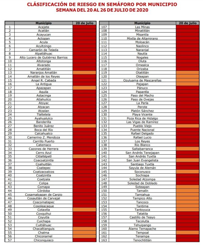 La secretaría de Salud informa que para la semana del 20 al 26 de julio, los municipios de la zona conurbada, Veracruz, Boca del Río, Medellín y Alvarado estarán color rojo del semáforo epidemiológico, es decir, en riesgo máximo de COVID-19.